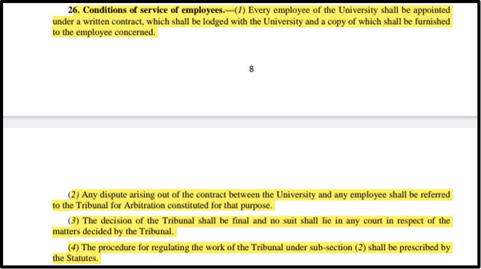 The SAU, in its objection to Bhattacharya’s petition, contended that Section 26 (Conditions of Service of Employees) of the South Asian University Act, 2008 and Rule 25.2 (Conditions of Service of Employees), framed by the university’s Standing Committee, confer exclusive jurisdiction on an Arbitral Tribunal to decide disputes arising from employment contracts between the university and its employees.