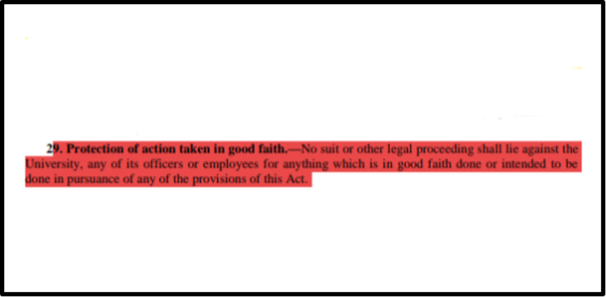 Chimni argued that this statute “doesn’t confer immunity from the writ jurisdiction of the courts. There is no basis to infer blanket immunity when your right has been violated by the university”.