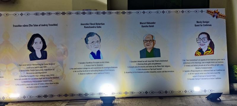 Posters calling eminent thinkers “Ravaanas heads” were put out outside the conclave venue. Among those villainised were academics like Kancha Illaiah, Romila Thapar, Wendy Doniger and Irfan Habib, among others. Many books with provocative titles like ‘Jesus Christ: An Artifice for Aggression’ or ‘Tipu Sultan: Villain or Hero?’ were also sold at the event venue. Students also pointed to objectionable panel discussion around pronouns used by the queer community.
