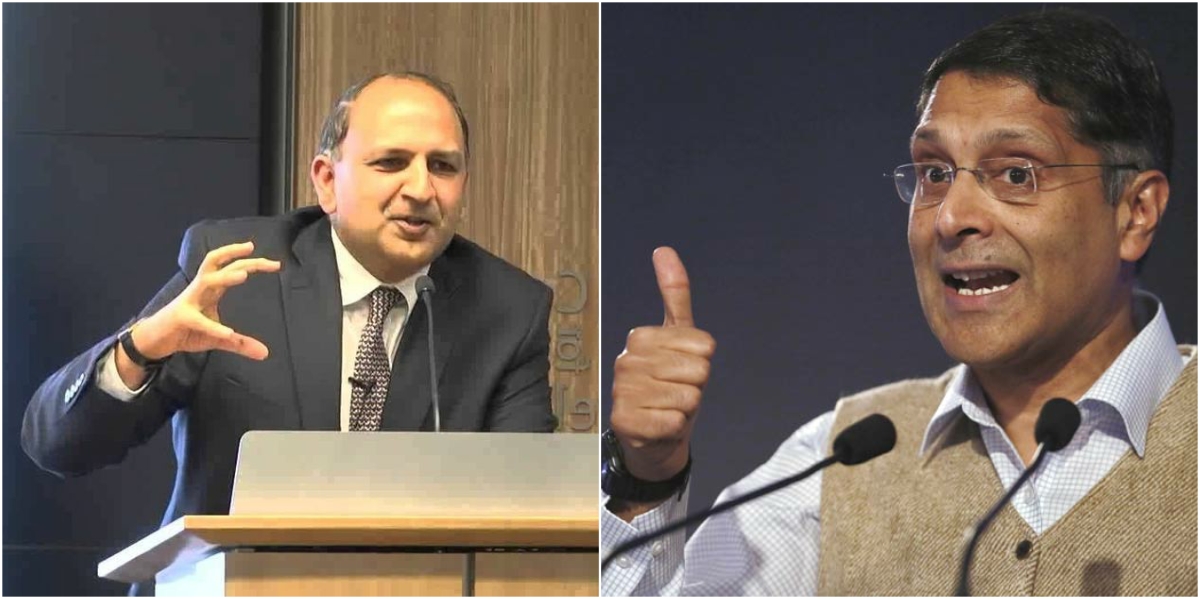 Pratap Bhanu Mehta and Arvind Subramanian. Photos: YouTube/PTI Illustration: The Wire.