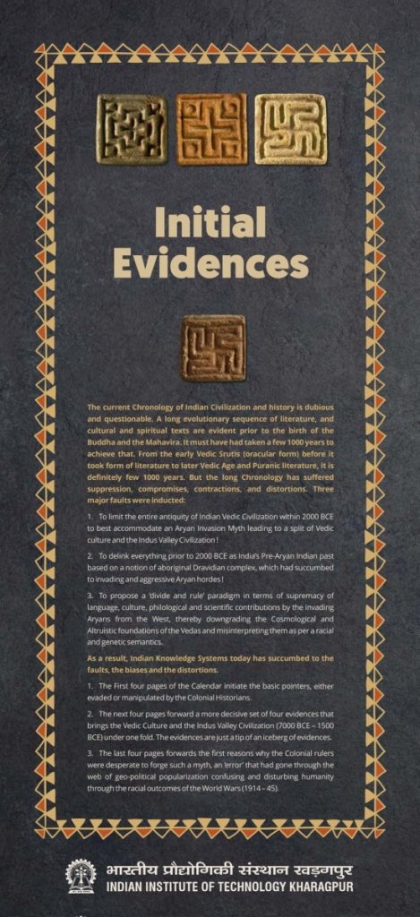 The 'Initial Evidences' page of the calendar identifies three major "faults" that were inducted in the chronology which resulted in Indian knowledge systems succumbing to "faults, biases and distortions”: a) limiting the antiquity of the Vedic civilisation within 2000 BCE, b) considering everything prior to 2000 BCE as India’s pre-Aryan past with Dravidians being considered aboriginals and c) proposed Aryan supremacy, “thereby downgrading the cosmological and altruistic foundations of the Vedas and misinterpreting them as per a racial and genetic semantics.”