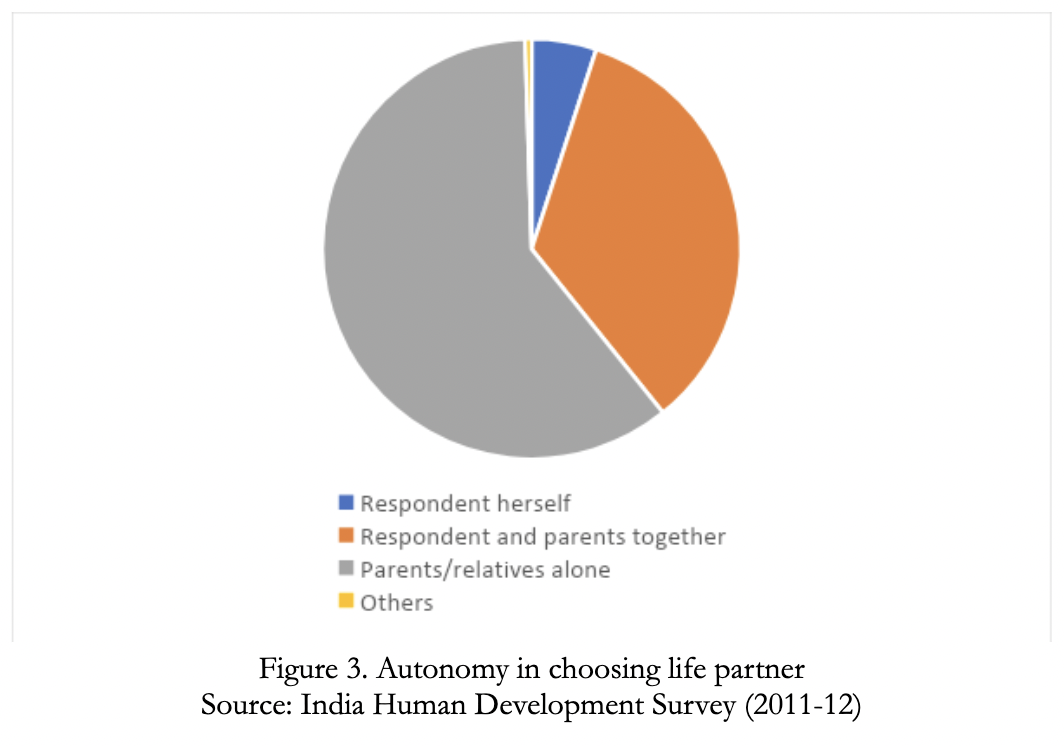 The question to be asked now is how improvement in specific indicators of female education has translated into substantive and qualitative changes pertaining to the labour market, socio-economic status, and autonomy for females. Exploration of these questions results in a mixed bag. The gender gap in asset ownership and lifetime earning remains a major concern. According to National Family Health Survey data, only 42.3% and 31.7% of females said they own a house and land alone or jointly, respectively. While 51.2% of women respondents agreed to have autonomy in financial matters, most of them did not have any autonomy in selecting their life partner. This is not surprising since most marriages continue to occur within the matrix of caste, religion, and class.