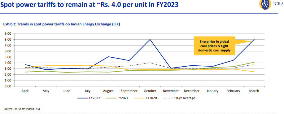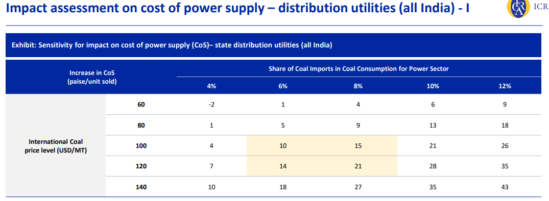 “Incremental impact on cost of power supply for the state-owned distribution utilities is estimated at about 18 paise/unit, in a scenario of share of coal imports at 8% (against 4% seen in 9M FY2022) in the overall coal consumption and based on international steam coal price level of 110 USD/MT (GCV of 4200 Kcal/Kg) (against 73 USD/MT in 9M FY22). The impact thus varies and remains sensitive to international steam coal price level, INR-USD exchange rate as well as share of coal imports for the power sector (sic),” the ICRA said.