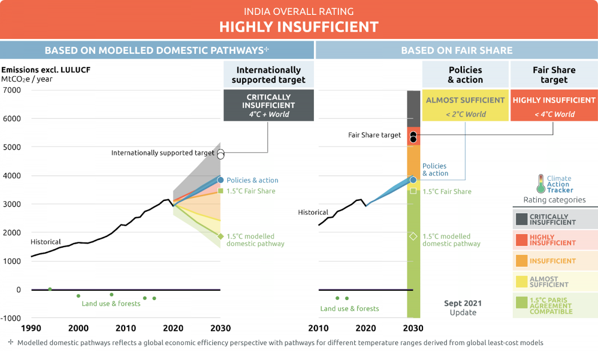 The Climate Action Tracker rates India’s climate targets and policies as “highly insufficient”. Under India’s current targets and policies, emissions will continue to rise and are consistent with a 4°C rise in temperature, which could have disastrous consequences.