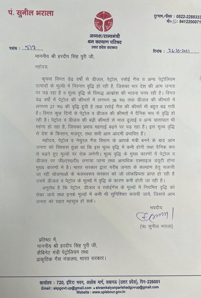 Bharala, who is the chairman of the Labour Welfare Council in Uttar Pradesh, has written to the Union minister for Petroleum and Natural Gas, Hardeep Singh Puri, noting public outrage over a Rs 36 increase in petrol prices over the last year and a half.