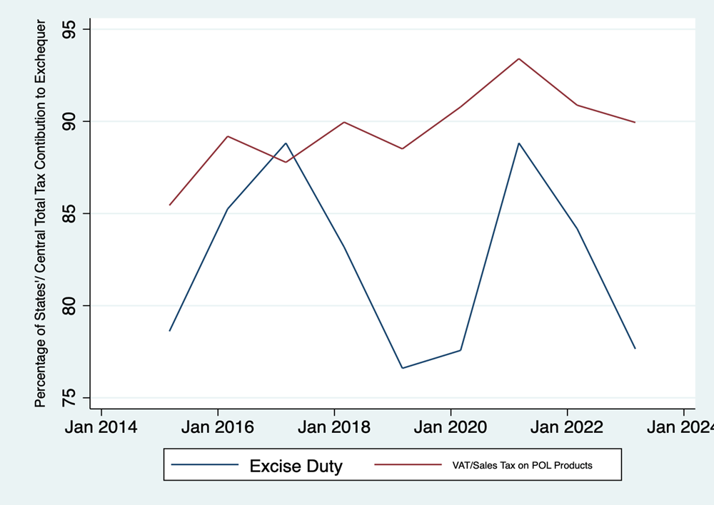 The Union government keeps a fixed rate of excise duties on the base price of petrol and diesel, which has contributed to an increasing dependence on the revenues from such duties.