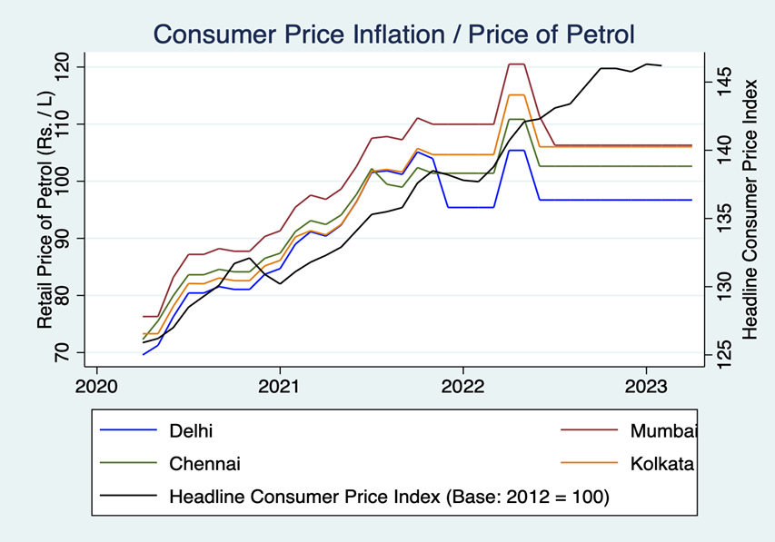 The chart below provides a mapping between CPI and oil price numbers across major cities across India.