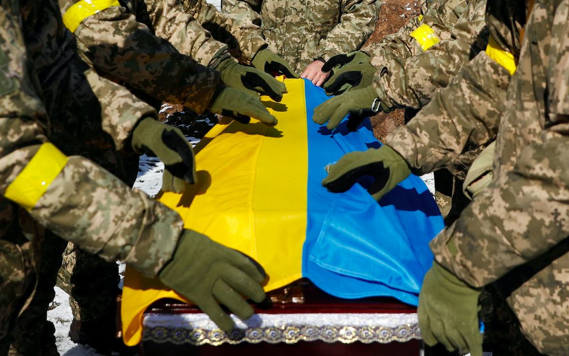 Members of the Honour Guard place the national flag to a coffin with a body of the member of the Ukrainian Armed Forces, Valerii, who was killed during Russia's invasion of Ukraine, during a funeral ceremony in Kyiv, Ukraine, March 8, 2022. REUTERS/Valentyn Ogirenko