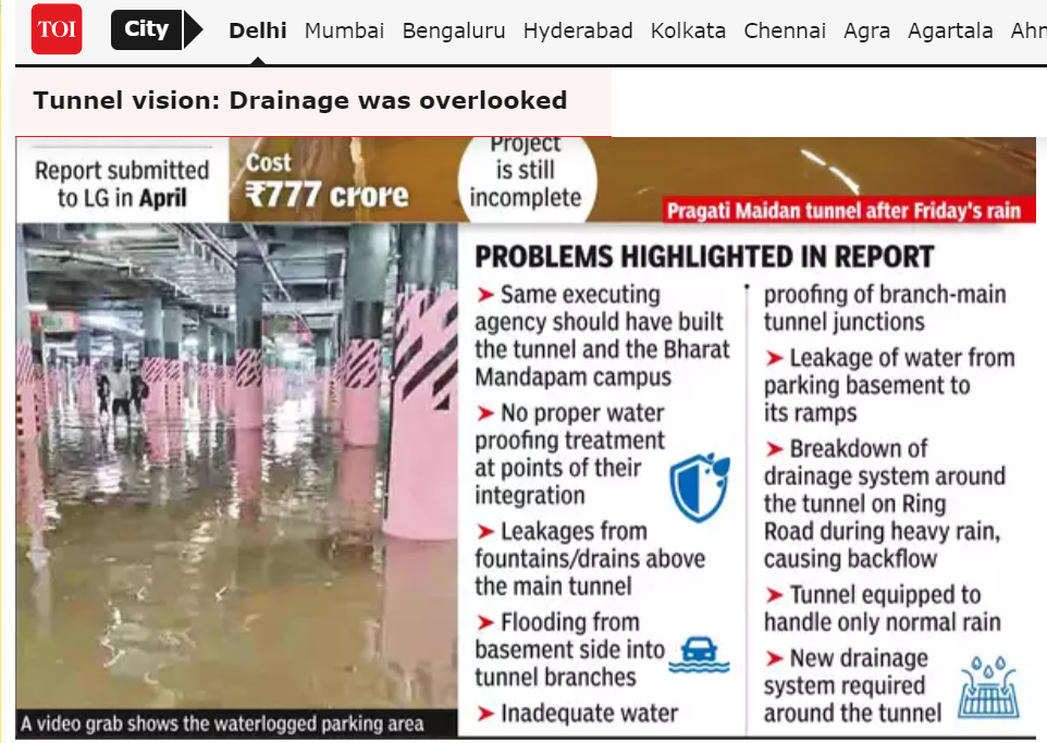 Flooding destroyed government officials' cars parked in the basements of their new flats at New Kidwai Nagar. The old, low-scale government housing in the same location never saw such a thing. Additionally, the frequent flooding of the new Pragati Maidan underpass – which connects to the New Bharat Mandapam’s massive 40 acre underground parking basement – throws the massive flow of Delhi to Noida traffic that has taken to using it, out of kilter for miles around.