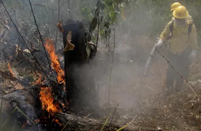 The dozen or so yellow clad firefighters from environmental enforcement agency Ibama easily cleared brush from around a burning stump with a leaf blower, doused it with jets connected to water packs mounted on their backs and covered it in earth.