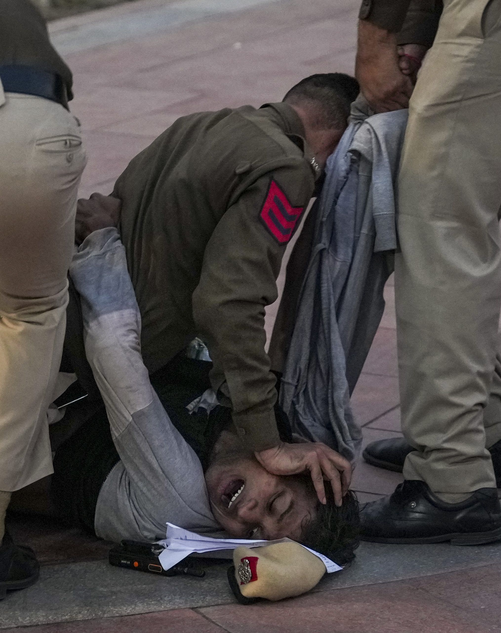 Police personnel use force against a protestor during a protest against worsening air quality in the national capital, near the India Gate, in New Delhi. Photo: PTI