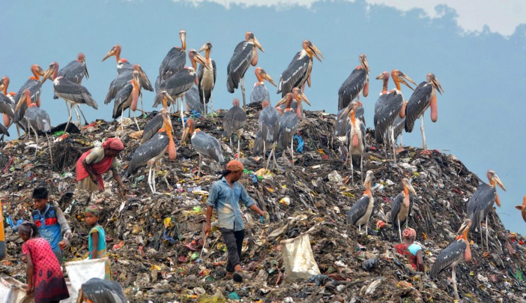 Rag pickers look for recyclable materials as greater adjutant storks perch at the Boragaon garbage dumping site, in Guwahati, June 4, 2022, a day ahead of the World Environment Day. Photo: PTI