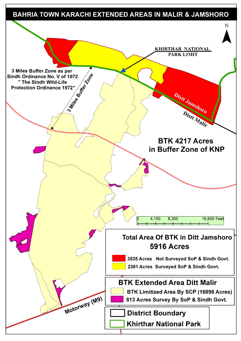 A map developed by Omer Darwesh, a geographic information system expert associated with the Sindh Indigenous Alliance, showing Bahria Town has entered Kirthar Mountain.