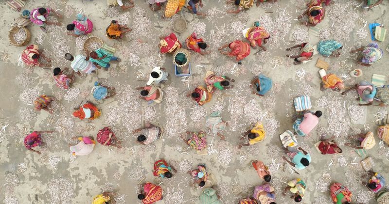 At Nijkasba, fish brought in by large boats is auctioned to traders and needs to be sorted immediately afterwards by species. This sorting is done by nearly 250 women who sit under open skies on a large cement platform by the river. This happens every day at 2 pm.