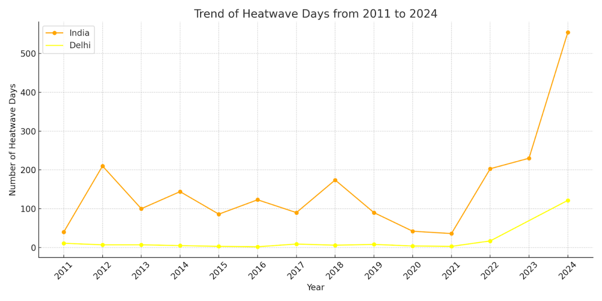 In March 2025, the India Meteorological Department IMD said that the number of heatwave days might double this year as compared to 2024, which was already a bad year with a record breaking 554 heatwave days. This rising trend is visible already.