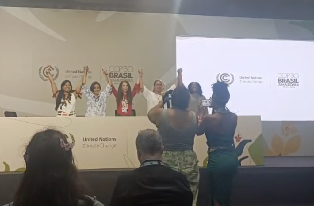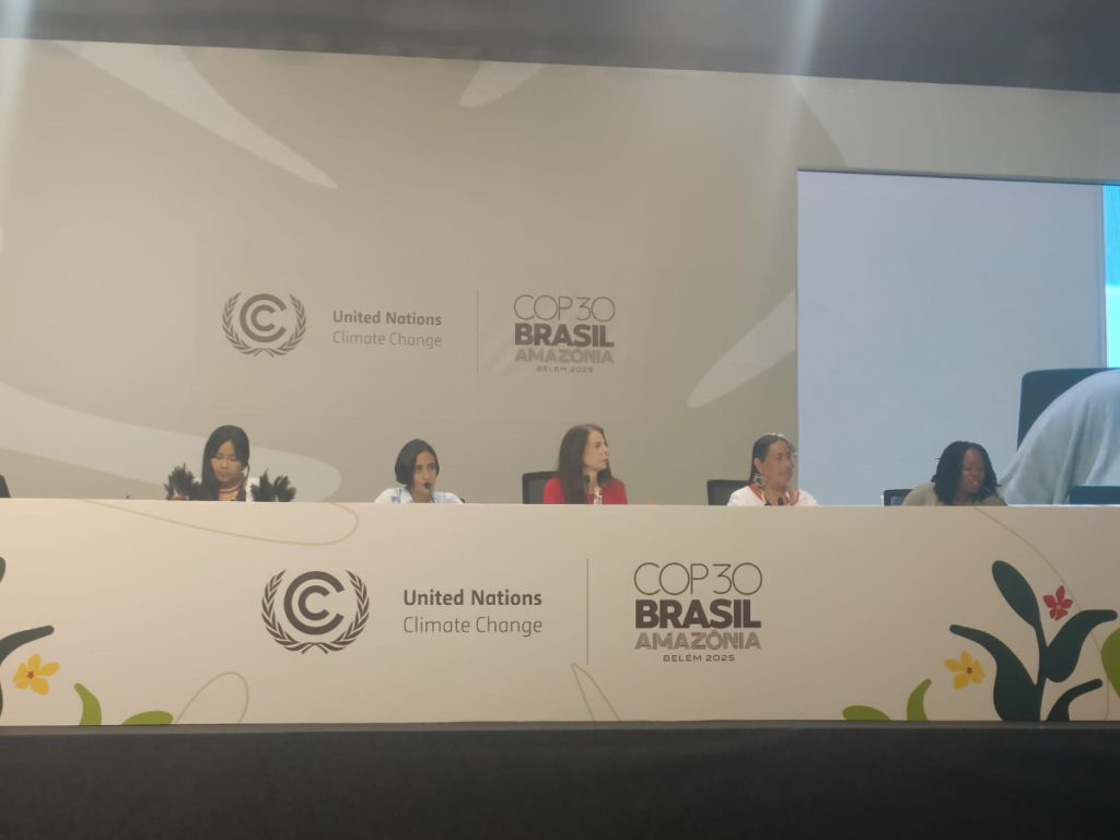 The Women's Earth and Climate Action Network's press conference on November 18 at COP30. Photo: The Wire.