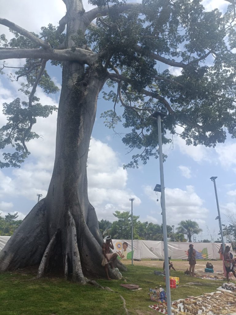 An indigenous person stands against a samauma tree at the COP30 venue. Photo: The Wire.