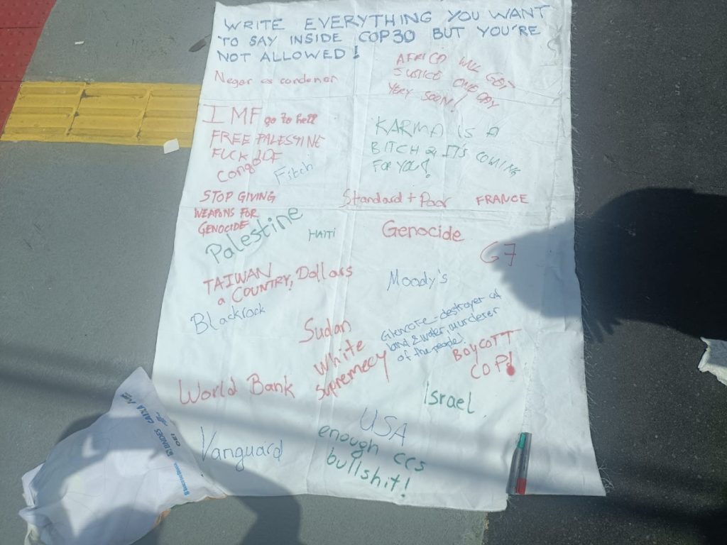 A protest at the COP30 venue on November 18. Photo: The Wire.