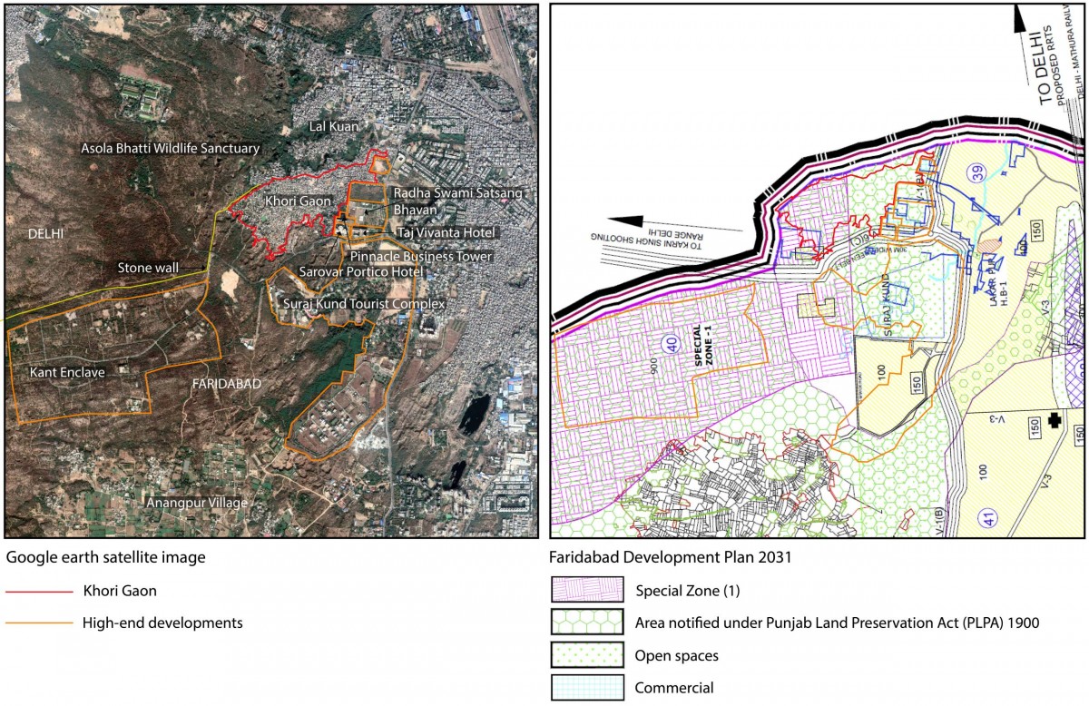 Satellite image and Faridabad DP map showing Khori Gaon and its neighbourhood constructions. Maps prepared by Ishita Chatterjee.