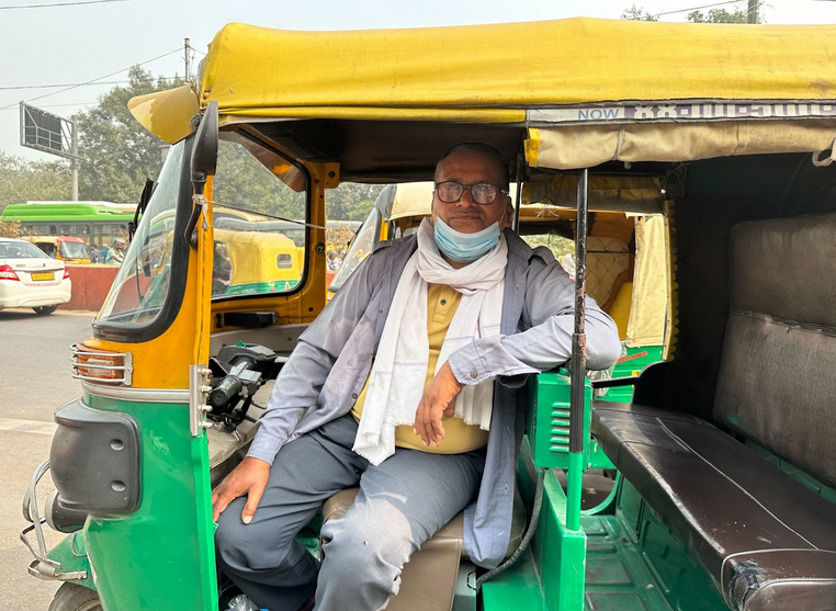 Riyaz, a migrant worker from Bihar, has been driving his auto for one and a half years. He also starts his work from Lal Qila. He says it has been difficult to drive in the polluted conditions.