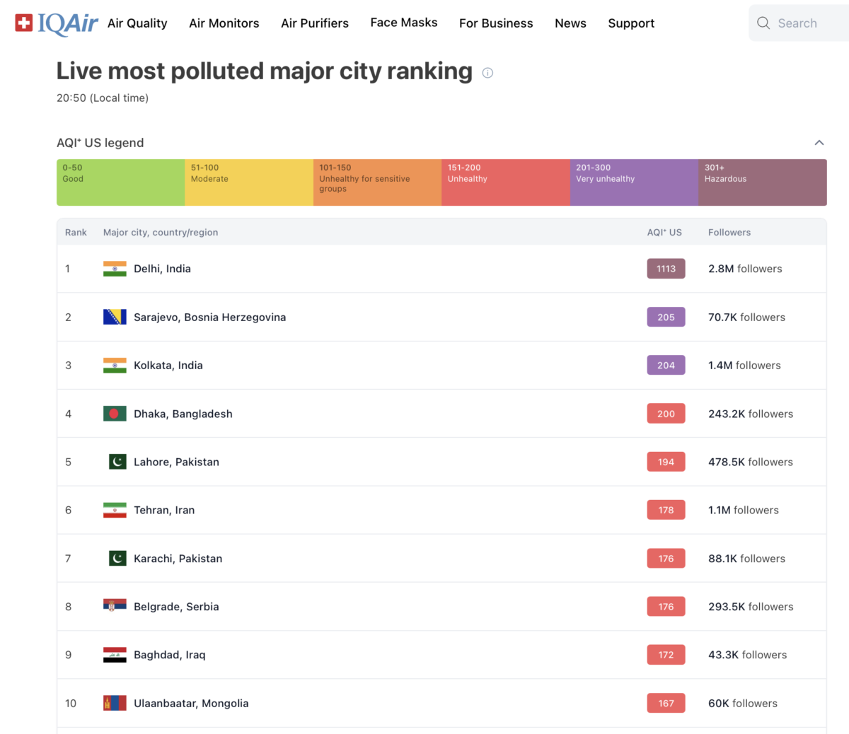 Delhi is currently the most polluted city worldwide. Kolkata is in third place in the ranking, with a US AQI of 204.