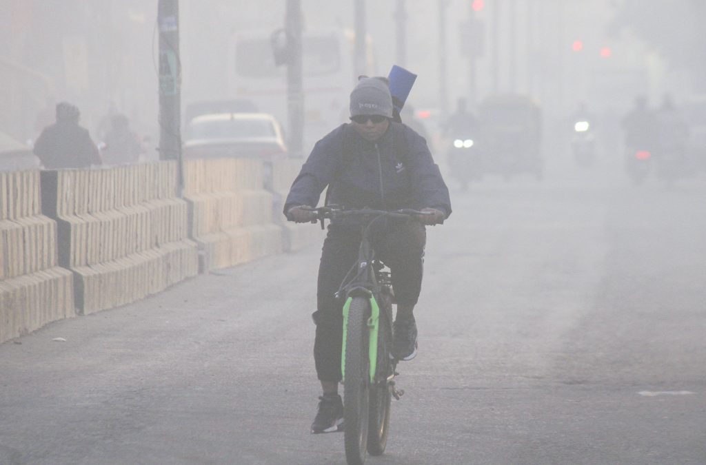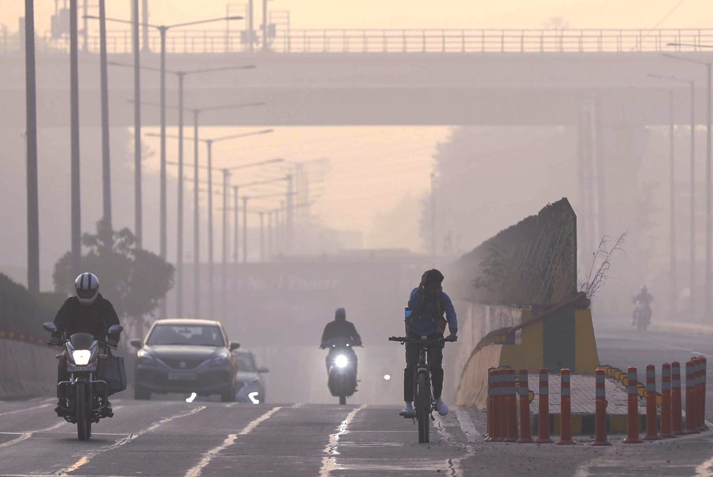 Commuters navigate through low visibility as air quality deteriorates, in Noida, Wednesday, Dec. 3, 2025. Photo: PTI .