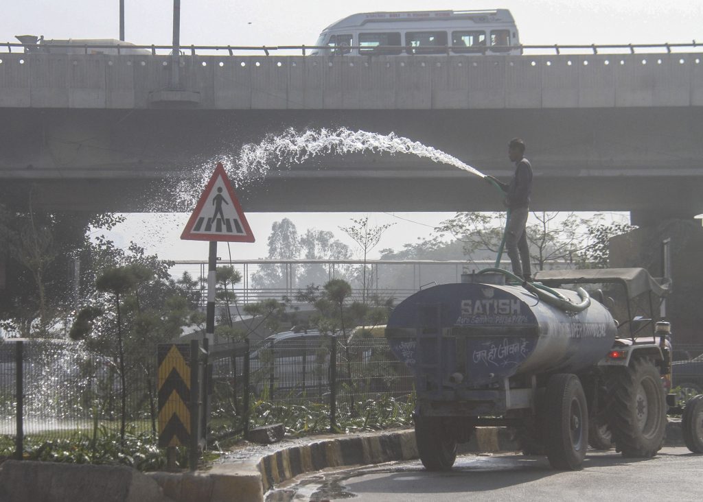 A worker sprinkles water on plants along a road divider as part of the efforts to curb air pollution, in Gurugram, Wednesday, Dec. 3, 2025. Photo: PTI.
