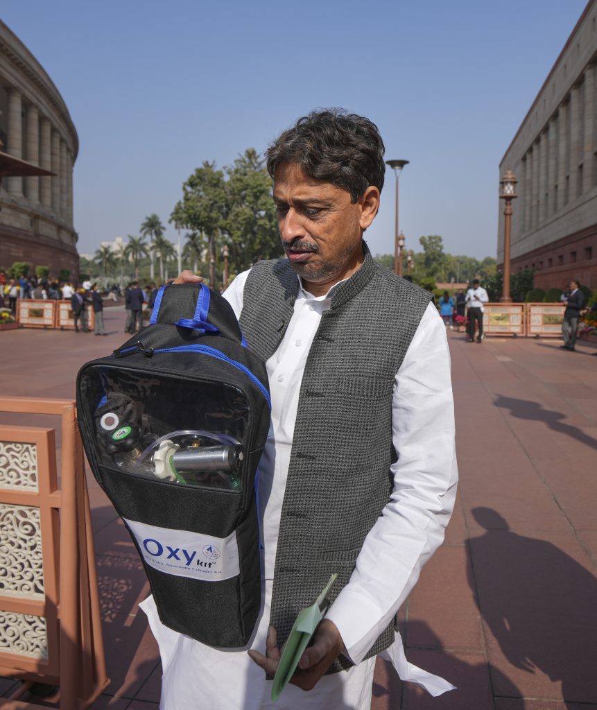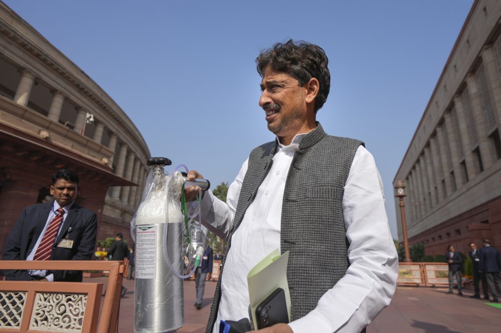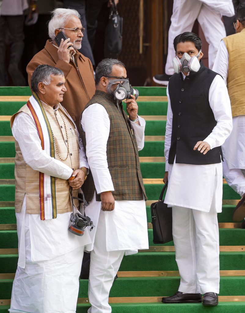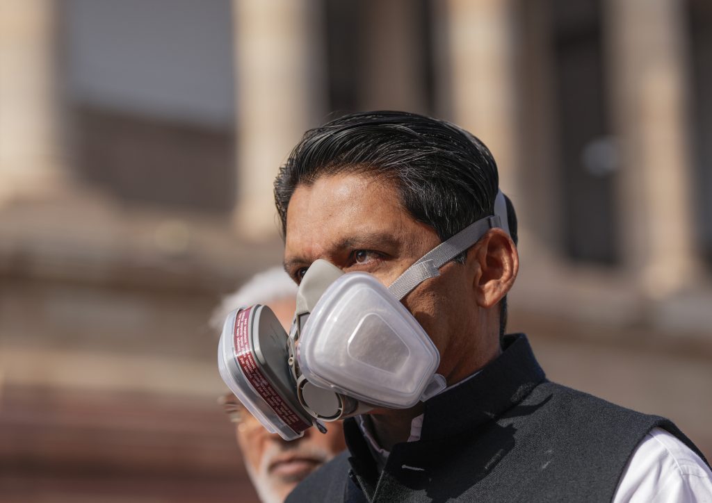 Congress MP Deepender Singh Hooda wears a respirator mask during the Parliament's Winter Session, in New Delhi, Wednesday, Dec. 3, 2025. Photo: PTI/Ravi Choudhary.