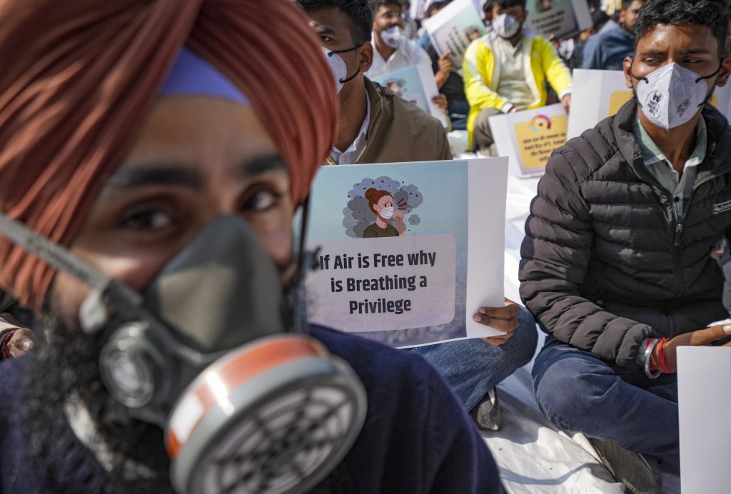 Demonstrators wearing masks hold posters during a protest demanding the government to take action to reduce air pollution, in New Delhi, Wednesday, Dec. 3, 2025. Photo: PTI Photo/Arun Sharma.