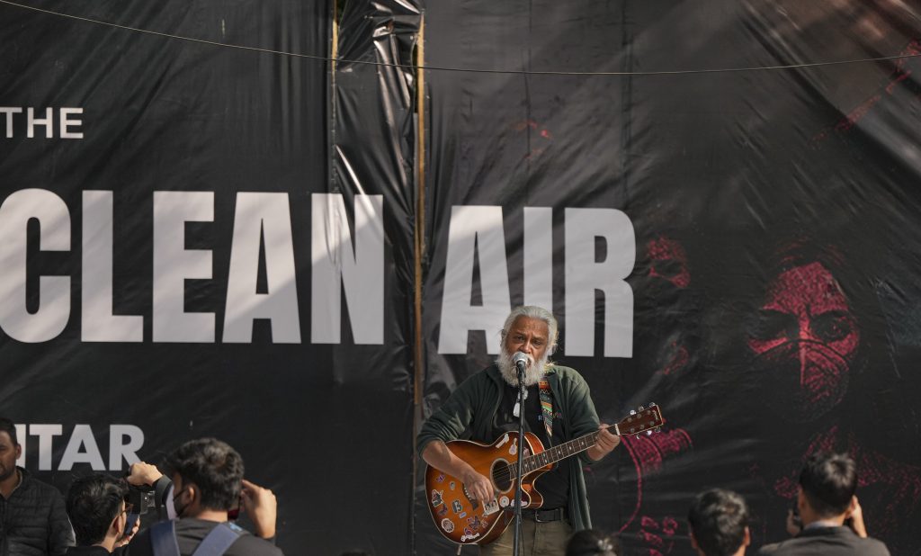 Indian bass guitarist, social activist and music composer Rahul Ram performs during a protest demanding the government to take action to reduce air pollution, in New Delhi, Wednesday, Dec. 3, 2025. Photo: PTI/Arun Sharma.