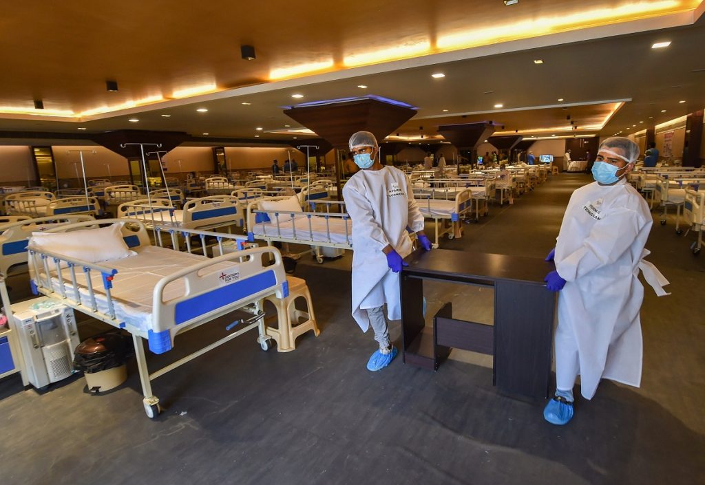 Health workers at Shehnai banquet hall, which has been converted into an isolation centre for COVID-19 patients in New Delhi, June 24, 2020. Photo: PTI/Manvender Vashist