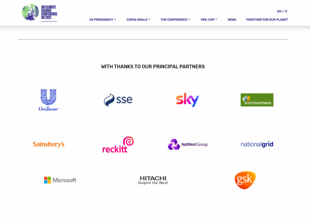 Corporate sponsors of the COP26 on the the conference website. Photo: Screengrab/ ukcop26.org.