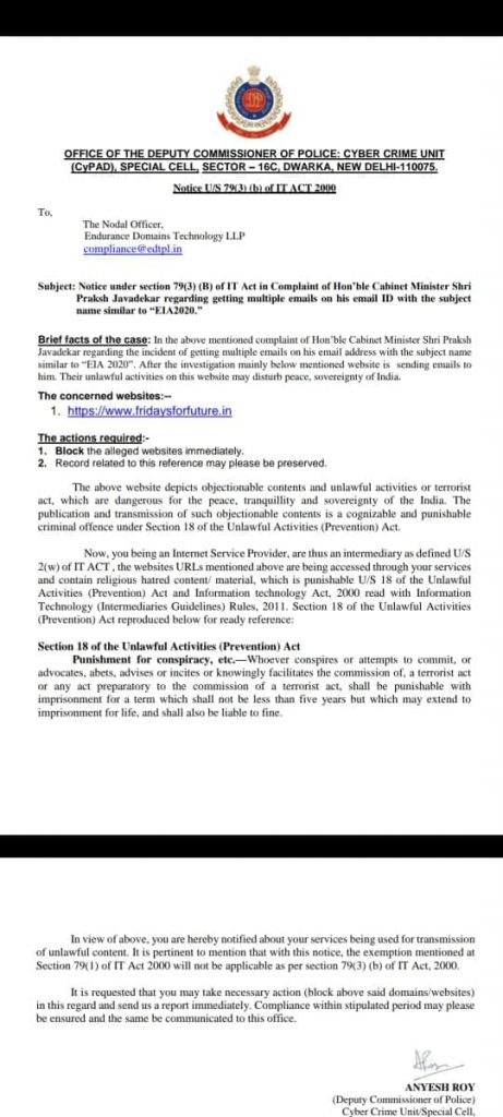 After “investigation” into the emails Javadekar received with subject “similar” to “EIA 2020”, the Delhi police found that “mainly” the Fridays for Future website was sending these emails. This, the Delhi police notice claims, could threaten “peace” and ‘sovereignty” of India.