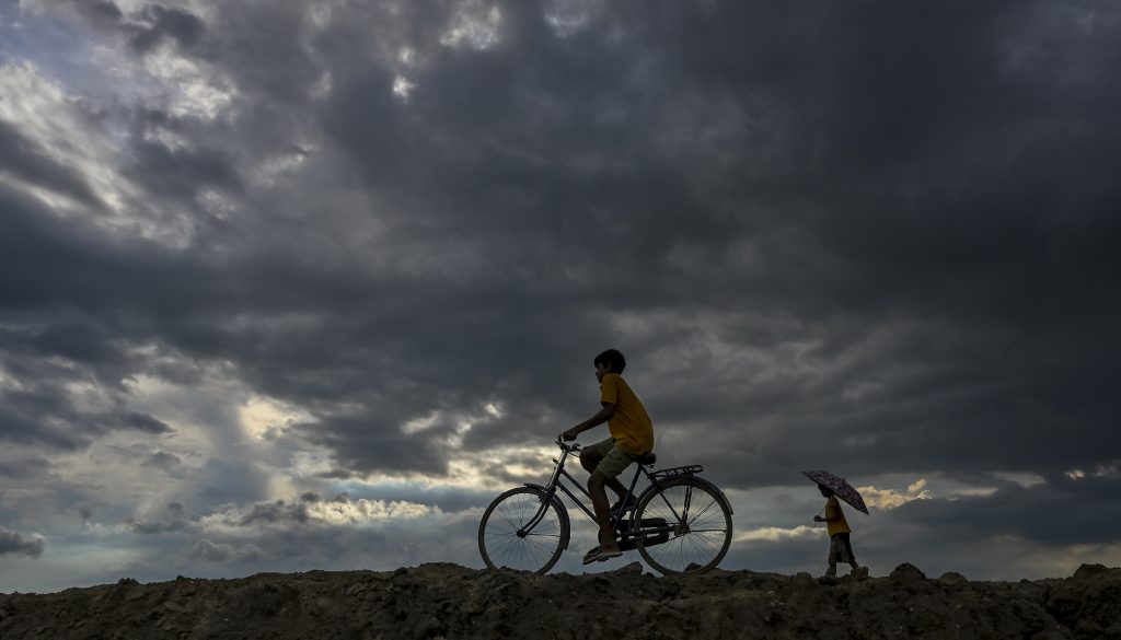 A boy rides a bicycle as dark clouds gather in the sky, in Nadia, West Bengal, Tuesday, May 27, 2025. Photo: PTI