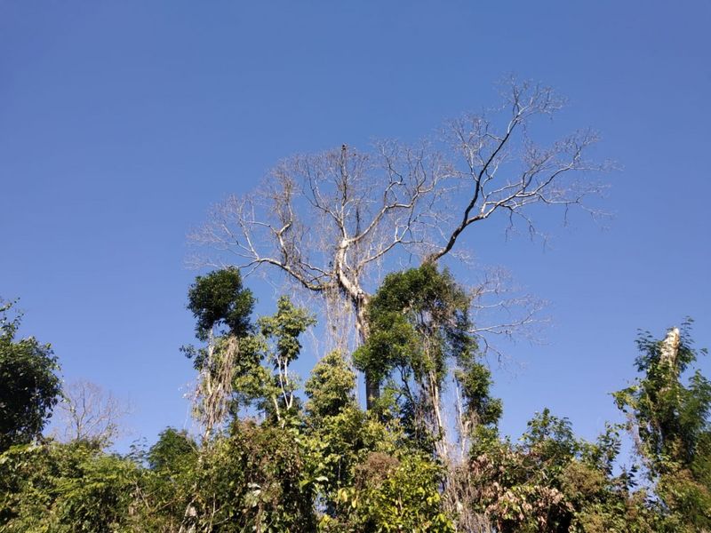 On our last day of climbing, we had gone to check on a great hornbill nest close to Dumsi Nala that had been used regularly until about two years ago. The cavity was 30 meters up, just below a fork in a 40-meter tall Tetrameles nudiflora. The branches overhead went every which way so all of us had to circle the tree twice, through the thick undergrowth, before we got the whole picture.