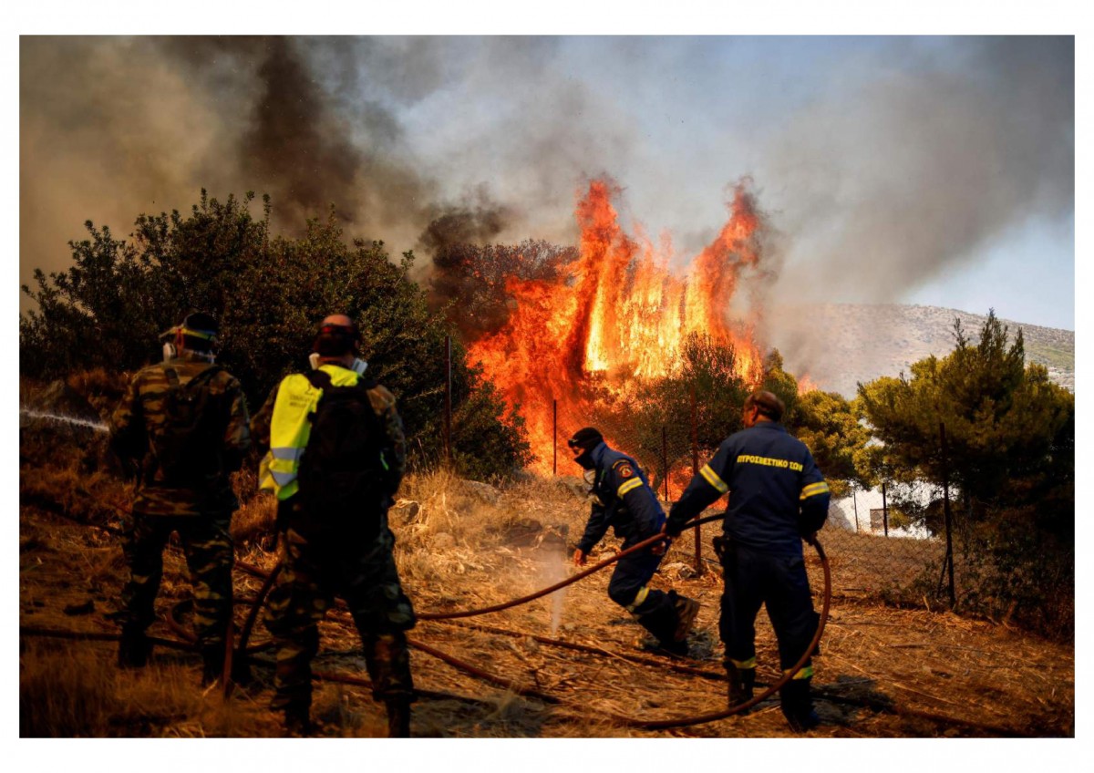 Firefighters and volunteers try to extinguish a wildfire burning in the village of Markati, near Athens, Greece, August 16, 2021. Reuters/Alkis Konstantinidis