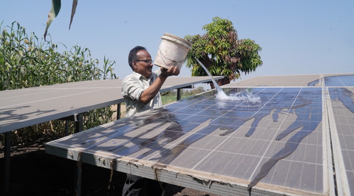 Arvind Dilkar, from Satara Village, Maharashtra wipes the dirt off solar panels since the performance of the panels decrease due to heavy coating of dirt. Photo: Suhail Bhat