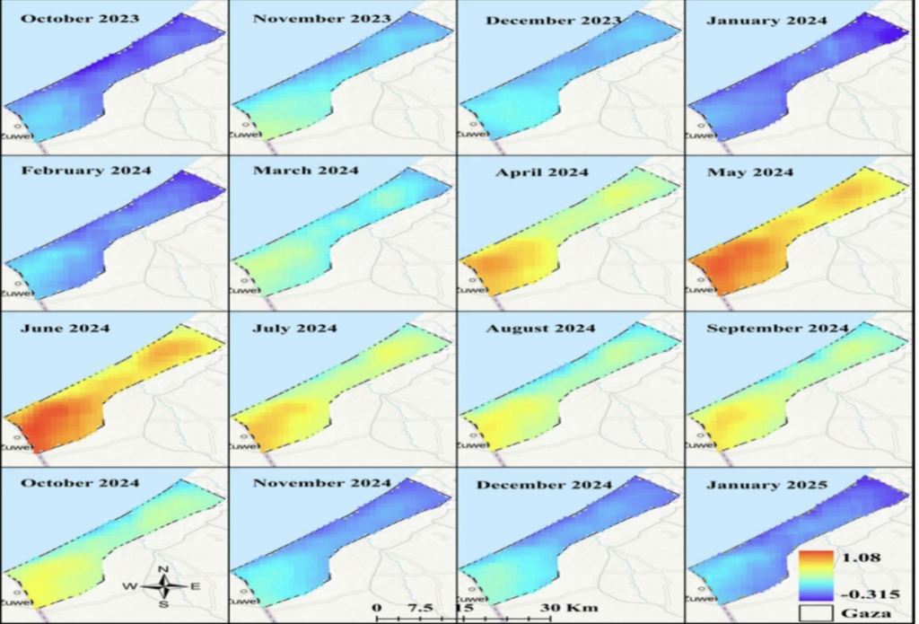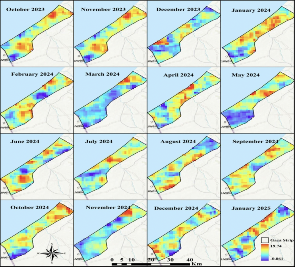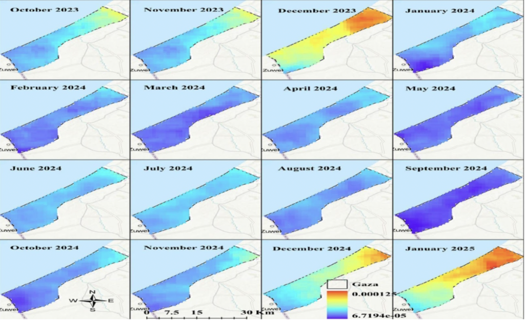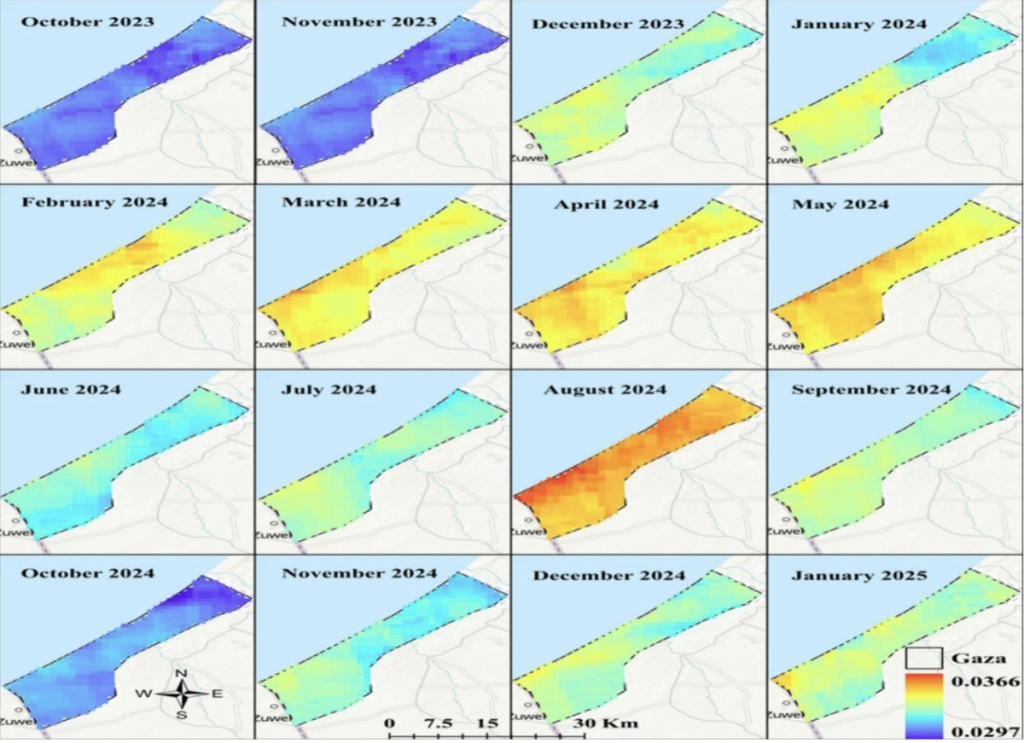 The study of NO2 patterns is interesting because after a temporary increase in December 2023, in what the paper assumes is due to military vehicle movement and emergency responses, NO2 levels dropped sharply and remained low throughout 2024. This is not necessarily reason to rejoice, because it could point to the collapse of transportation, industrial activities, and fuel supply chains – reflecting the contrasts in even the narrowest studies of the environment and the difficulties associated with quick conclusions. The study did, however, note a mild resurgence in December 2024 and January 2025 over Gaza City and Deir al-Balah, perhaps in a suggestion of a tentative reactivation of urban life and recovery activities.