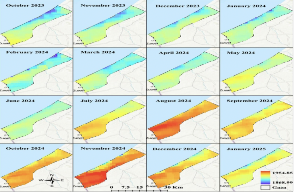 While they declined in October, areas such as Rafah continued to exhibit elevated levels into January 2025, in what the study finds is a phenomenon underscoring the lasting environmental impact of conflict in southern cities.