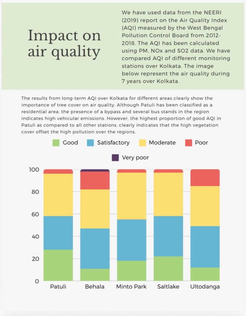 The air pollution levels are lower here compared to other city areas. “Patuli shows a significantly higher level of ‘good’ AQI compared to other localities in the city based on West Bengal Pollution Control data from 2012 to 2018,” adds Haldar. (See chart below)