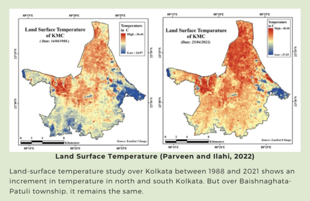 The report cites satellite data of more than three decades to claim that the temperature in the area has not gone up in that time. The satellite data was obtained from a 2022 study by Tania Parveen and Rahaman Ashiq Ilahi on the Kolkata Municipal Corporation area from 1988 to 2021. Going through the study, The Climate Thinker members saw that the temperature had not risen in the Patuli area when almost all other localities showed a sharp temperature rise.