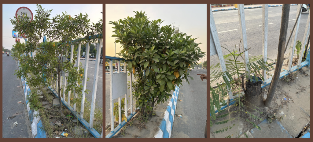 Trees planted by Manoj Mukherjee on the divider. The image on the extreme right is of a tree cut down in 2023. It had been planted by Mukherjee. Photo: Chandrima S. Bhattacharya.
