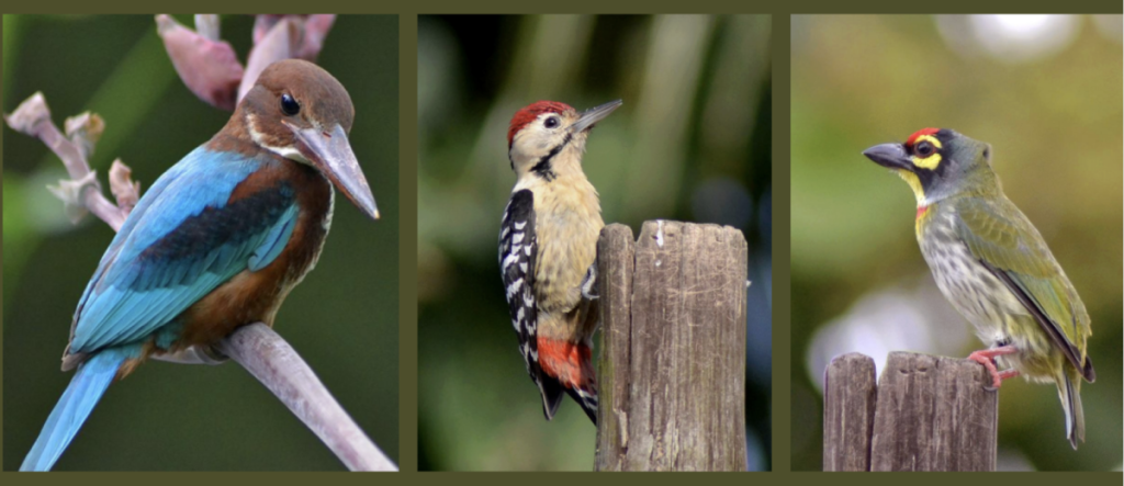 The white-throated kingfisher, the fulvuous breasted woodpecker, and the coppersmith barbet. Photos: Amit Naskar.