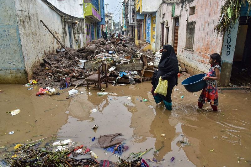 Commuters walk on a waterlogged street near Charminar in Hyderabad, October 19, 2020. Photo: PTI