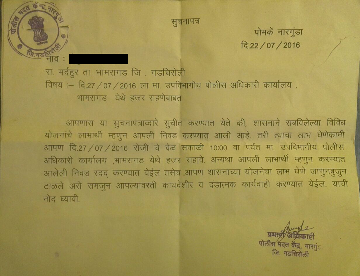 During the CPI (Maoist) martyrs’ week, the police sent an adivasi village in Bhamragadh a passive-aggressive letter that tells us a lot about the nature of the ‘welfare state’ in India:‘This letter seeks to inform you of your selection as a beneficiary for various government schemes. To avail of these benefits, you must report to the sub-divisional police officer (SDPO), Bhamragadh office by 10:00 am, 27 July 2016. If you don't register your presence at the meeting, your name will be deleted from the beneficiary list; legal and punitive action will be initiated against you for deliberately refusing to avail benefits of government schemes.’