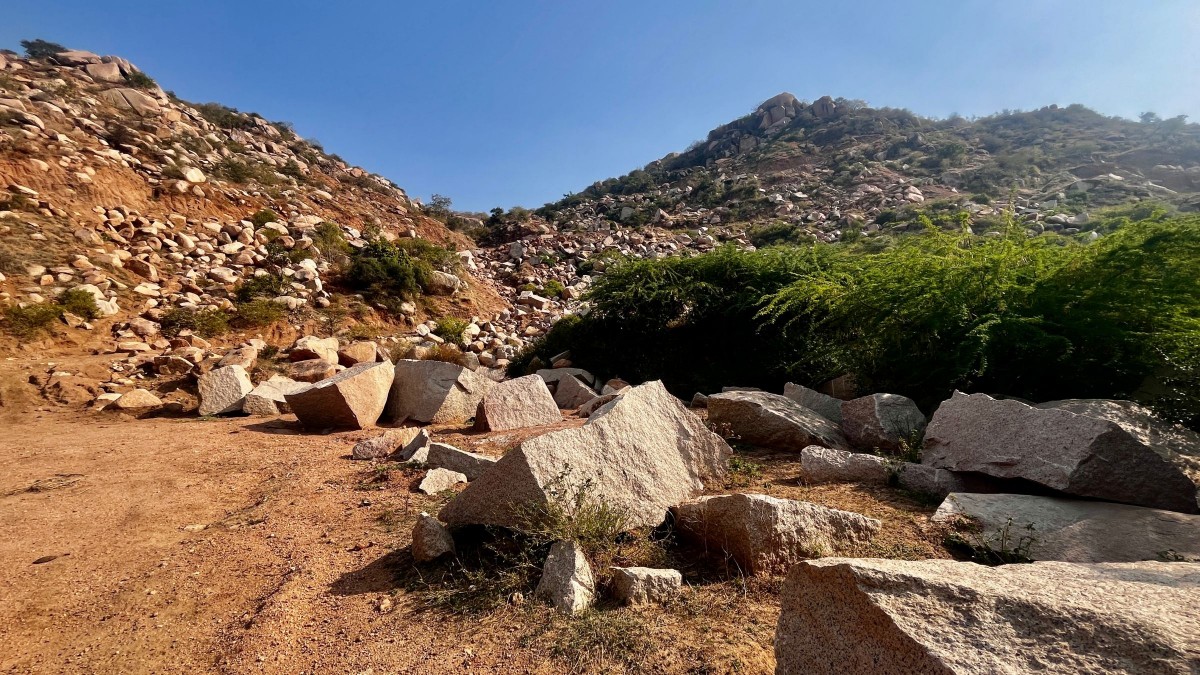 Blocks of granite extracted during mining still sit near the mountains, along with tyre marks. Photo: Tarushi Aswani
