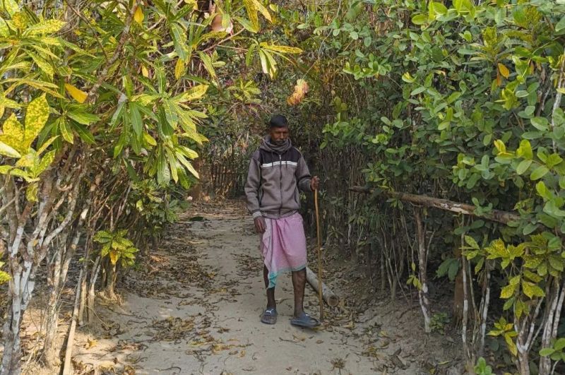 Sukhram Gour standing in front of his house.