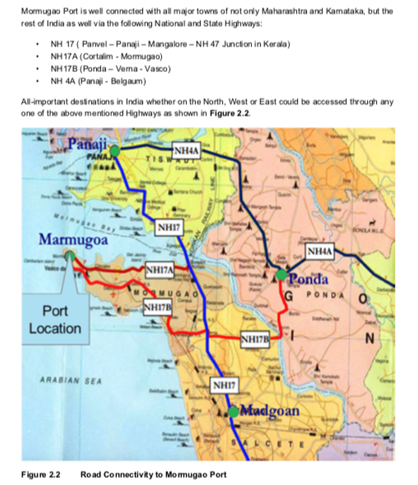 The Adani terminal at MPT (berth number 7) moves coal from MPT to other parts of India through the existing South Western Railway, as well as the NH17B highway. The NH17-B highway connects to the NH4A highway which moves through the Mollem region.
