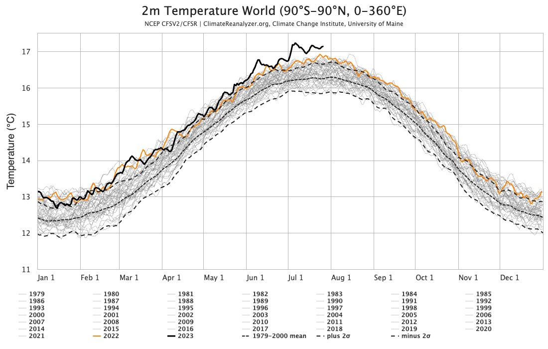 Global daily surface air temperature (°C) from 1 January 1940 to 23 July 2023, plotted as time series for each year. 2023 and 2016 are shown with thick lines shaded in bright red and dark red, respectively. Other years are shown with thin lines and shaded according to the decade, from blue (1940s) to brick red (2020s). The dotted line and grey envelope represent the 1.5°C threshold above preindustrial level (1850–1900) and its uncertainty. Data: ERA5. Credit: C3S/ECMWF.