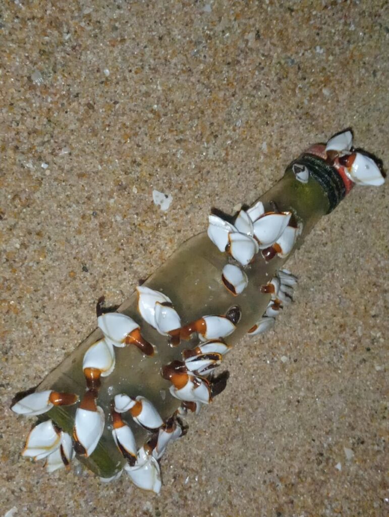 A washed up bottle with goose barnacles highlights prevailing currents that are pushing flotsam from the deep sea to Chennai's beaches. Photo: S. Palayam, Science of The Seas, 2025.